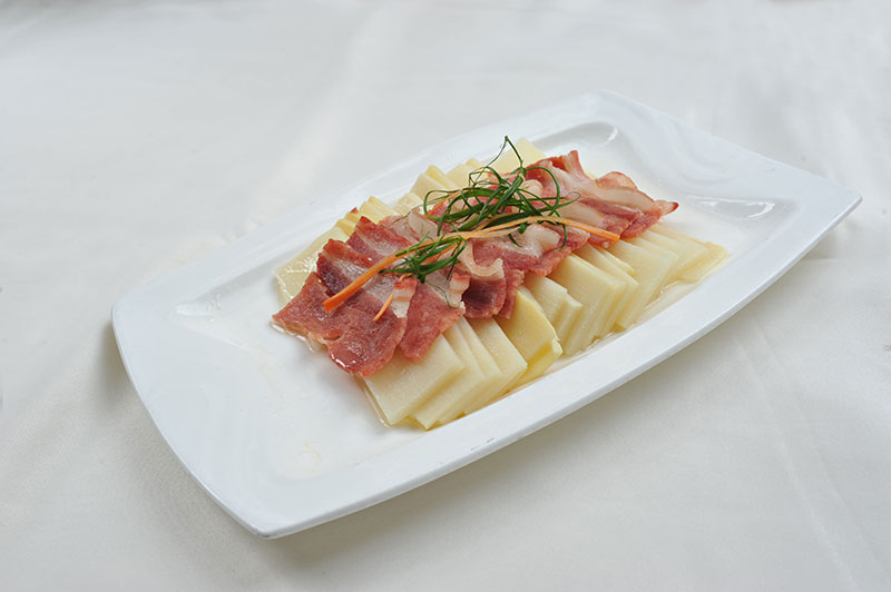 1.竹筍切片洗凈,培根煎至雙面金黃取出切片待用;